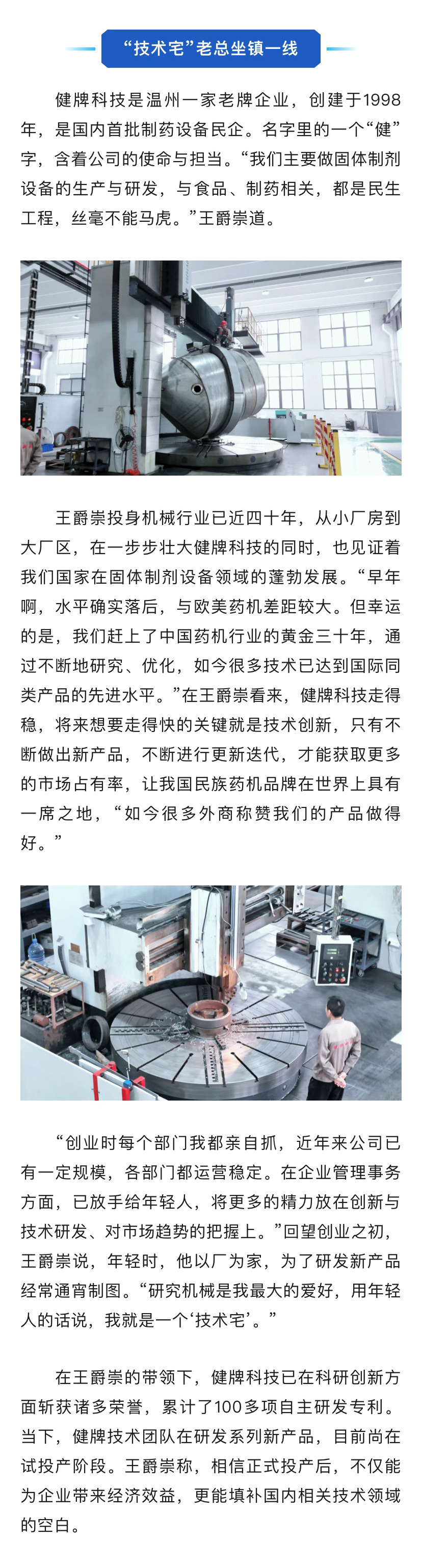 浙江健牌機(jī)械科技有限公司創(chuàng)建于一九九七年,為專業(yè)制造研發(fā)食品制藥設(shè)備、新能源設(shè)備的供應(yīng)商。高新技術(shù)企業(yè),火炬計劃項目承擔(dān)單位、省專精特新企業(yè)。中國制藥裝備行業(yè)協(xié)會會員單位,中國醫(yī)藥設(shè)計協(xié)會理事單位。健牌技術(shù)力量雄厚,加工和檢測設(shè)備齊全,生產(chǎn)均嚴(yán)格按照國家GMP規(guī)范執(zhí)行,研發(fā)的制藥機(jī)械設(shè)備的技術(shù)性能與質(zhì)量水平均達(dá)到先進(jìn)水平。