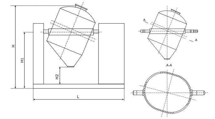 采用桶體的重心偏心、軸向偏心、上下偏心的三偏心原理以及六向不對稱的設(shè)計方式:上下角度容積不對稱、左右角度容積不對稱、前后角度容積不對稱。按照該設(shè)計原理所產(chǎn)生的單面不同容積多向錯位交叉運(yùn)動,以達(dá)到最佳的物料混合效果。