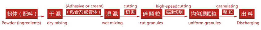 粉料在錐柱體容器內(nèi),經(jīng)底部攬拌器充分?jǐn)嚢?,同時(shí)通過(guò)壓力噴淋粘合劑(或則膏體),使物料混合成濕潤(rùn)碎狀軟材,然后再經(jīng)側(cè)置的高速制粒刀切割成均勻的濕顆粒,出料同時(shí)經(jīng)整 粒機(jī)再次的整粒作用,控制顆粒目數(shù),以達(dá)到各種顆粒的要求。